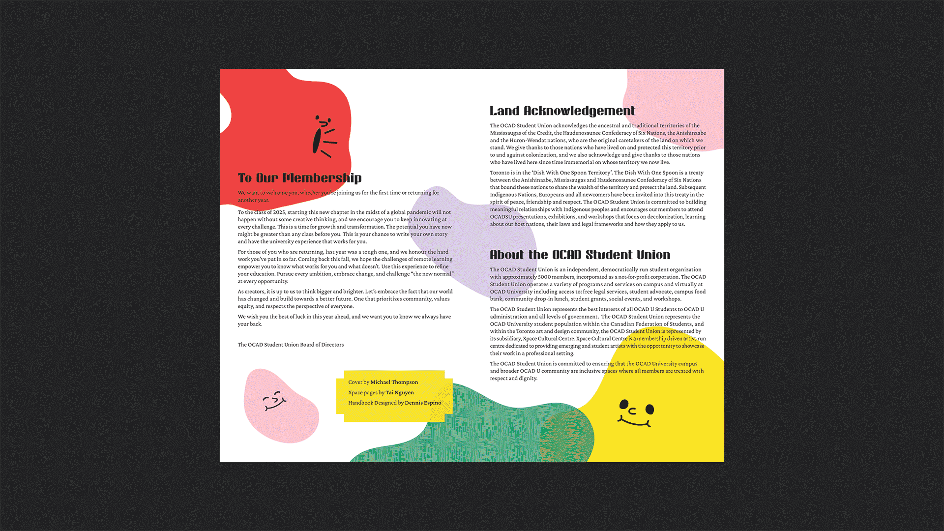 Commissioned by the OCADU Student Union, I was tasked to design 7 spreads for this publication as the handbook designer. The handbook’s design was inspired by zine aesthetics.
